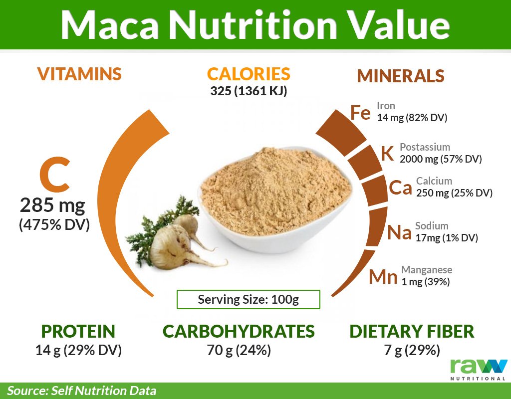 Maca có lợi ích dinh dưỡng tuyệt vời. Ngoài việc là một nguồn cung cấp Sắt, Vitamin C và Đồng rất tốt, nó còn chứa một lượng vừa phải Kali, Vitamin B6 và Mangan. Ngoài ra, nó là một nguồn protein thực vật tự nhiên tuyệt vời.