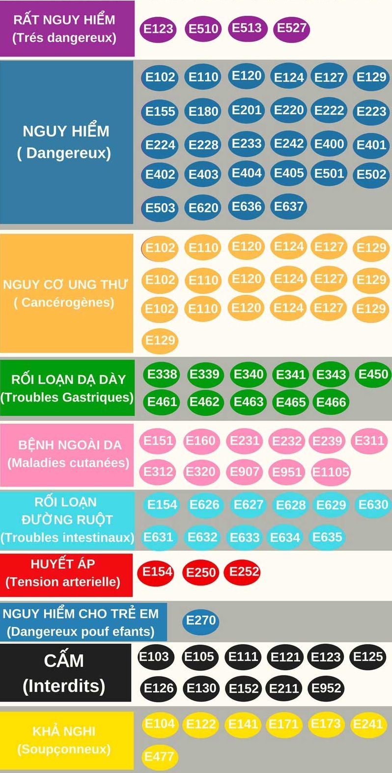 Bên dưới là bảng tổng hợp các chất phụ gia gây nguy hiểm đến sức khỏe, bệnh tật, chúng ta hãy nhớ và lưu lại khi tìm mua thực phẩm tiêu dùng