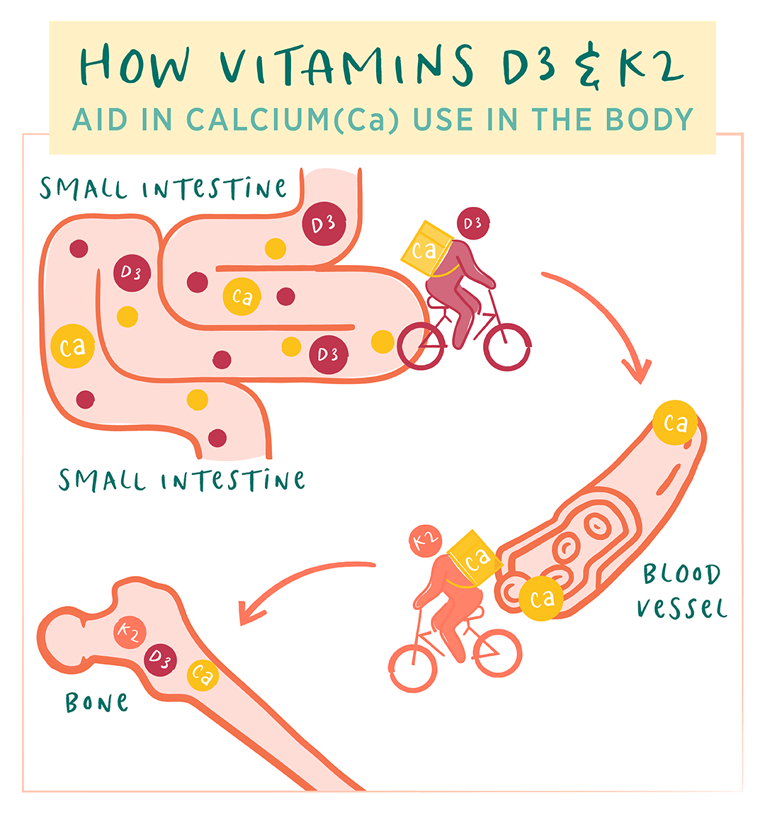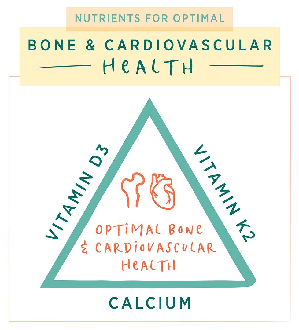 -Bộ ba chất dinh dưỡng này - canxi, vitamin D3 và vitamin K2 - tương tác và làm việc hiệp đồng với nhau để giữ cho xương của chúng ta khỏe mạnh và chắc khỏe cũng như hệ thống tim mạch của chúng ta hoạt động và linh hoạt.