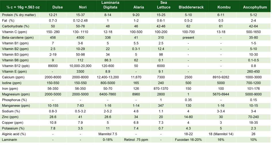 Dulse có hầu hết các loại vitamin nhóm B,và các khoáng chất cần thiết cho cơ thể như:magie, kẽm, phốt pho,canxi,mangan, sắt....với hàm lượng cao nhất trong tất cả các loại tảo.