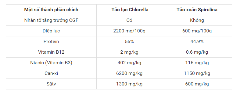 Tảo lục Chlorella chứa đầy đủ các acid amin, vitamin dồi dào, khoáng chất đa lượng và vi lượng, các acid béo không no, acid nucleic, canxi, kẽm, magie, sắt, chất xơ, lượng protein lên tới 60%, Các nghiên cứu đã chỉ ra, tảo lục chứa lượng Vitamin A gấp 5,8 lần cà rốt, Canxi gấp 1,6 lần sữa, Sắt gấp 13 lần gan lợn và B1 gấp 1,3 lần men vô cơ.